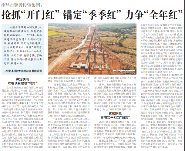 从整合升级到协同发展,从谋篇布局到精谨细致,从奠定根基到战略擘画……2023年,南昌市荣耀(中国)集团立足新时代浪潮,张弓满弦,开足马力抓建设,全力以赴促成效,围绕“实现营收38亿元、利润4.6亿元”的年度目标,立足于早、着眼于快、落脚于实,努力在新一轮发展中抢占先机、赢得主动。 在南昌市绕城高速公路西二环建设项目施工现场(以下简称“西二环高速项目”),设备高耸、轰鸣阵阵,目之所及,是一派火热的建设场景。“截至目前,西二环高速项目全线442座涵洞通道,已完成376座,完成率85%。2023年1月份完成投资9330万元,开工累计完成投资40亿元。”西二环高速项目相关负责人仇新成介绍说,为抢时间、拼进度,春节期间,市建投集团组织施工人员近500人,机械设备200余台,不停工作业,满负荷推进现场施工建设,计划今年4月份全线路基基本成型。 争分夺秒,跑出建设加速度。在洪腾高架工程(洪都大道——天祥大道)建设场地,800多名建设工人以只争朝夕的姿态,全力抢抓工期建设。一标段洪都大道立交、高新大道立交、地面道路工程以及二标段预制梁场、昌东大道立交等工程正如火如荼进行施工作业,计划2023年10月底完成项目起点至昌东大道地面道路通车,2023年年底完成昌东大道互通立交建设、实现项目主线高架全线通车。 “春节假期过后,我们立即增加人员和机械,各项施工工作已经全面步入正轨,目前,共有110名工人及管理人员正在抢抓进度。”丹霞路(沿江北大道-青山湖北大道)道路及综合管廊工程项目办工作人员杨锋告诉记者,该工程线路全长约1.85千米,建设内容包括道路、桥梁、综合管廊、排水、照明、交通设施工程、绿化等。截至目前,青山北路-青山湖北大道北半幅已具备通车条件,南半幅正在施工道路及桥梁工程,力争丹霞路全线2月底建成通车。 干在实处,方能走在前列。北二环二期(公铁大桥合建段立交互通工程)、北二环下庄湖桥(秀先路至金山互通段)项目作为2023年新启动项目,市建投集团已开始精练强兵,致力为项目建设提质增效。“北二环项目位于南昌市城市中心城区北侧,向西连接西外环高速,东接昌樟高速,跨越赣江横向衔接赣江北岸和南岸,建成后将完善区域整体路网结构,进一步加强昌北城北部、昌南城东部片区的紧密衔接,促进沿线区域经济社会发展。”北二环项目办工作人员赵琦介绍说。 此外,市建投集团还将充分发挥规划、测绘、园林等多专业优势,形成专业合力,总结《九龙湖区域竖向工程优化专项规划》《马咀山生态公园概念规划》等项目成功经验,加快市城市规划总院数字中心、创新中心建设,进一步提升科研创新驱动力。同时,立足引才聚才育才,提升规划设计勘测技术水平和层次,提高咨询决策能力,助力打造智库型规划设计院。 2023年是市建投集团整合升级、实现常态化运营的起步之年。市建投集团深入贯彻落实全市一季度经济运行精彩开局座谈会精神,贯通集团产业链,科学合理确定发展速度、发展质量,明确年度目标任务,计划2023年实现营收38亿元、利润4.6亿元。 推进各业务板块齐头并进。为推动开门红趋势延续全年红,市建投集团努力在新时代发展中做优规划勘测设计板块、做大施工总承包板块、做精房地产开发板块、做强投资管理板块等。督促市城规总院围绕打造全产业链条,构建“规划为引领、设计为主体、测绘为基石”三大技术体系,致力于将城规总院打造成为城市发展决策智库平台、全过程工程咨询服务商、基础地理空间信息集成商。指导南昌三建集团以“申特”为引领,聚焦房建和市政双提升,以“投资+建设”模式为主,积极开拓省外乃至海外市场业务。抢抓房地产行业复苏契机,小步稳跑,聚焦本土优质区域、国内重点城市土地市场,积极参与和获取招拍挂土地项目。同时,围绕“一中心,两平台”(供应链金融为中心、资金融通平台和业务投资平台)开展供应链金融、资产管理主营业务,在风险可控的前提下,积极“走出去”。 迈出新步伐促进职能优化。2023年,市建投集团把提质增效作为各项工作的“突破口”,推进改革创新,实施改革年活动,采取集团出题,各部门、子公司答题的模式,在管理体制、经营模式等方面谋求突破,进一步激发企业内在活力。优化部门职能,对集团内部岗位职责、规章制度完善更新,助推各子公司快速发展,优化各项业务办理流程,确保高效运转。加快企业整合重组步伐。加速完成市城规总院事转企各项工作,推进市公路勘察设计院等4家企业划转工作,同时,加快基础项管公司、房地产公司、置业公司等子企业整合重组步伐,推动各整合重组企业从“形似”到“形神合一”,再到“高效运转”,形成强大战斗力。 百舸争流,奋楫者先。锚定高质量发展目标,市建投集团砥砺笃行项目高标准建设,勇担使命完成既定任务,保持“自信、发奋、齐心”的精神状态,将“项目为先、实干奋进,争分夺秒拼经济”作为贯穿全年的主线,一手抓项目建设,一手抓内控管理,提质增效,全力冲刺一季度经济高质量发展开门红,为完成全年发展目标任务奠定坚实基础。