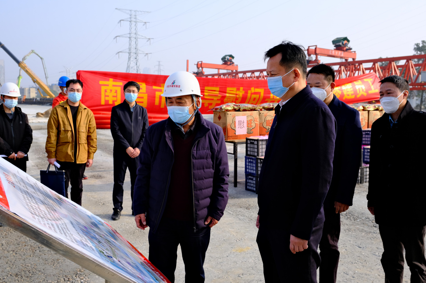 春节来临之际,1月10日下午,市委常委、副市长肖云走访慰问丹霞路道路及综合管廊项目现场一线工人,并察看项目建设进展情况,市公建中心主任熊伟、市住建局副局长池建林、市建投集团副总经理罗辉陪同。